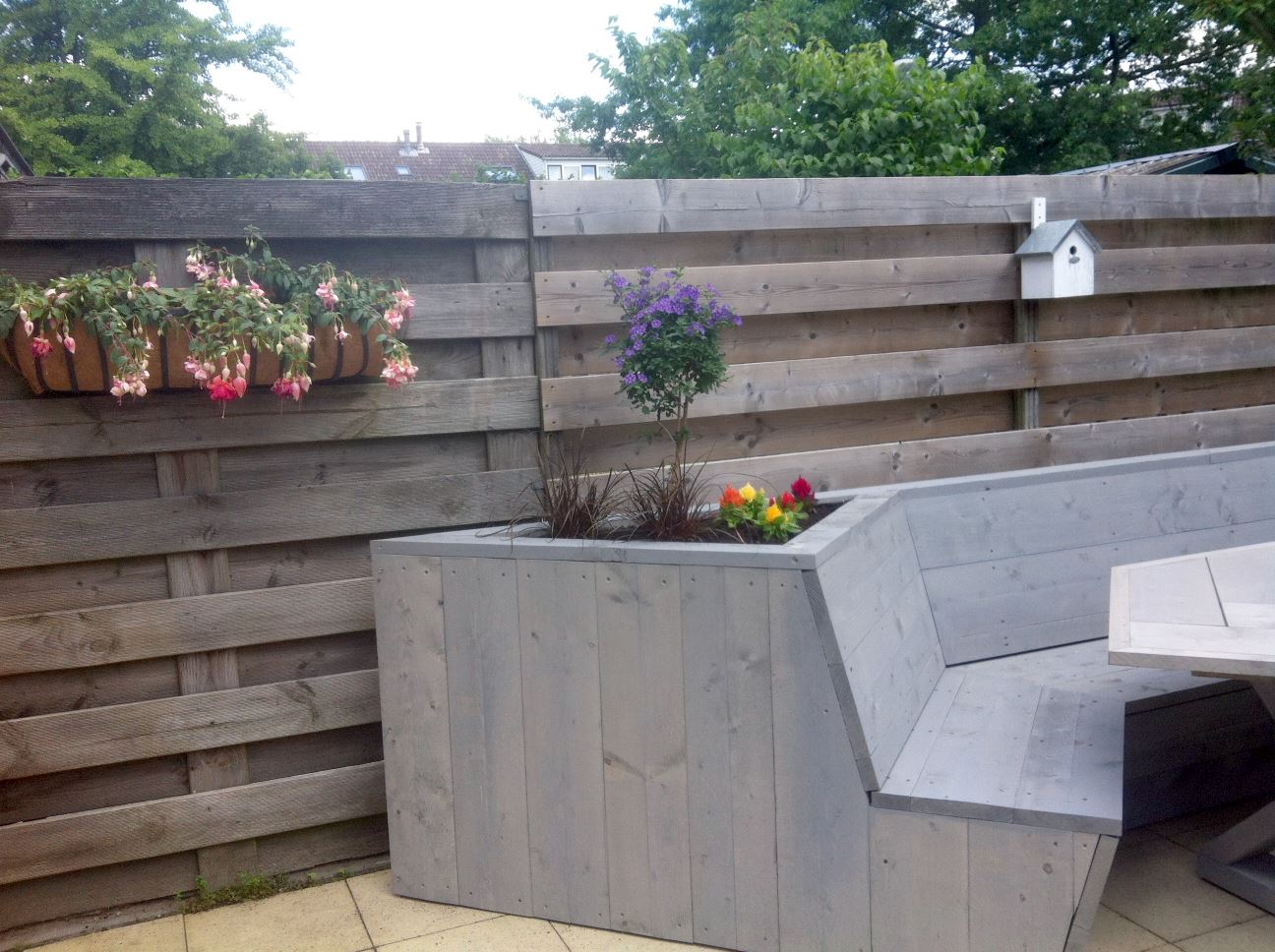 Van steigerhout maakte ik deze tuinset met geïntegreerde plantenbak. Door het geheel grijs te beitsen is hij goed bestand tegen weersomstandigheden.