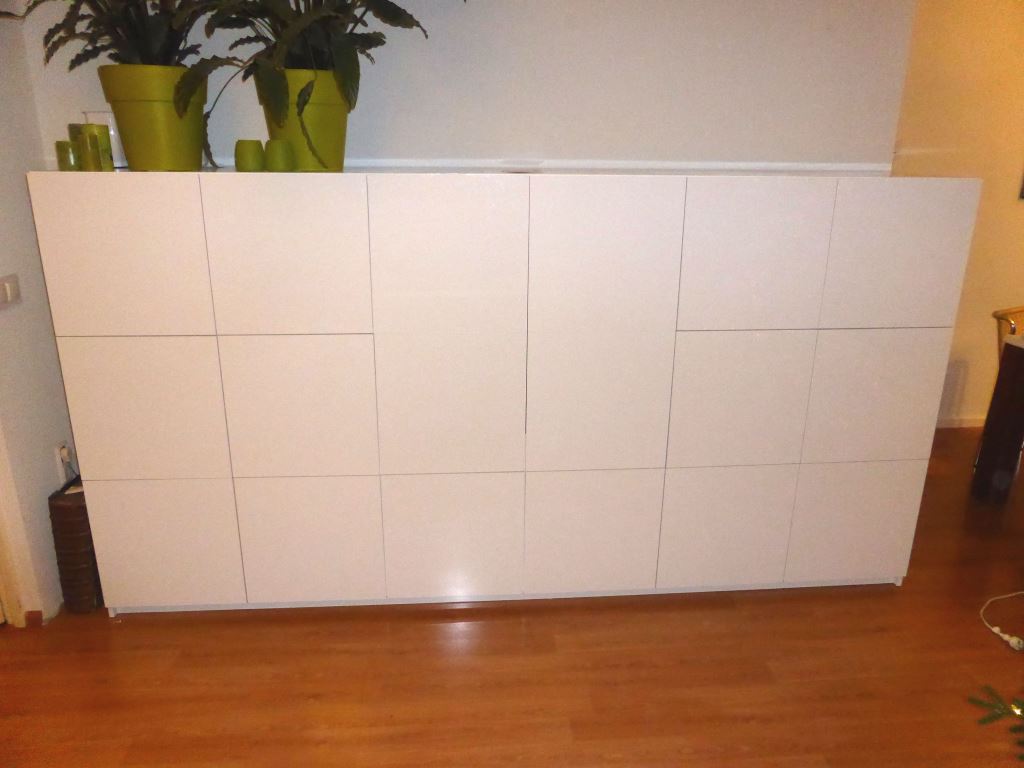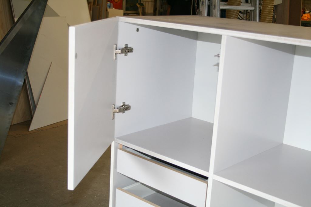 De deurtjes wilden ze zonder greepjes, dus met een druk/klik systeem en de deuren voor het tv gedeelte moesten optisch ook 4 vakken lijken en opzij weg kunnen schuiven zo strak mogelijk. Dat heb ik kunnen realiseren door er vakverdeling in te fresen en een speciaal montagesysteem te bevestigen waarbij de deuren iets naar voren komen en daarna opzij schuiven.